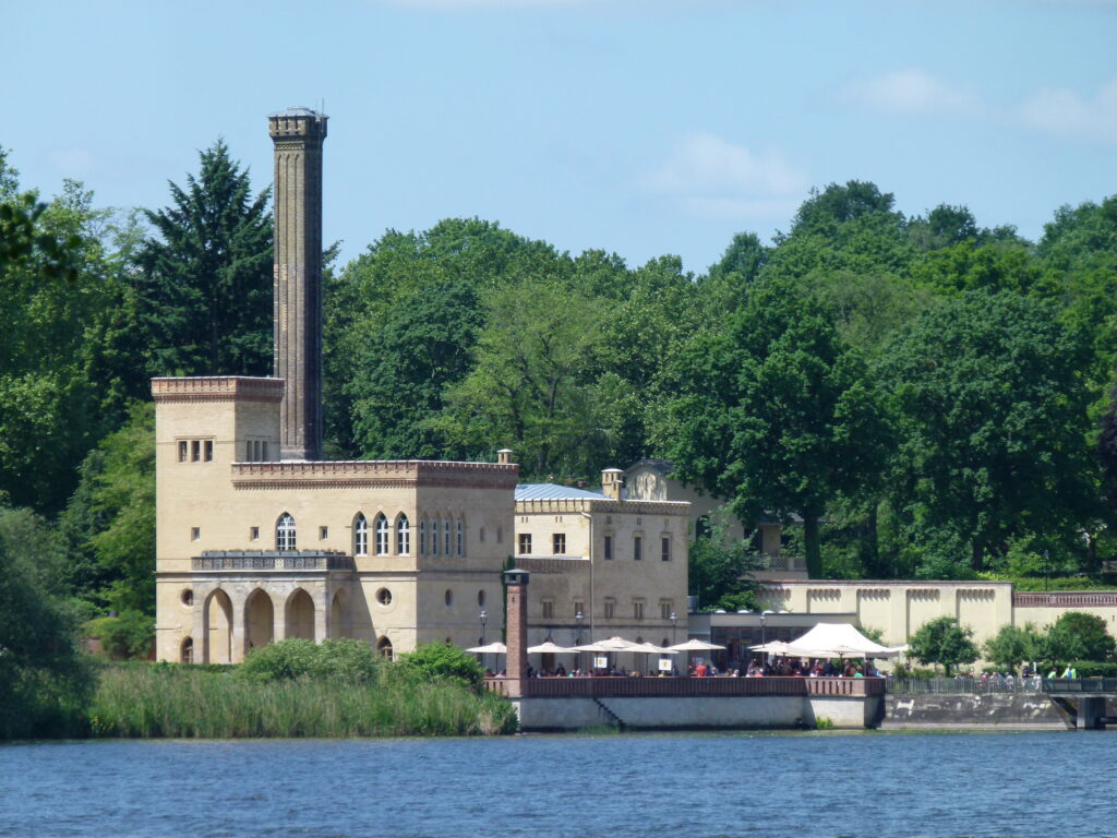 The dairy was by the way expanded under Friedrich Wilhelm IV. of Prussia, an upper story came on top 1843-44 by plans of Ludwig Persius. A tower was added as well as a crenellation for the Norman character of the property. But that was not all: in 1861 when the dairy closed down, the property was extended by waterworks with a pump house and, in prominent position, a high square chimney with battlements. It rises like the trees around rank and slim into the sky over the lakes, Jungfernsee at its feet, Heiliger and Tiefer See not far away – but not up to Pfingstberg, to Belvedere with a panoramic view over Potsdam.