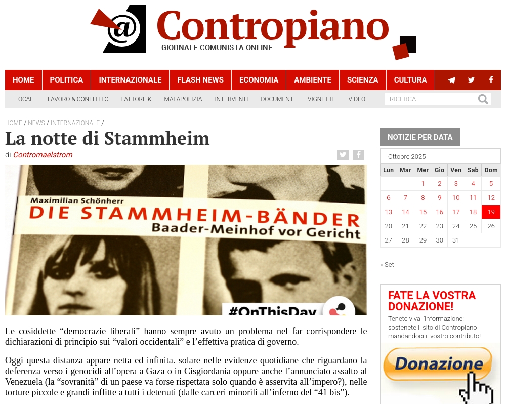 Berlin, Germany (Weltexpress). On 18 October 2025, the communist magazine ‘Contropiano’ (giornale communista online) published an article (without attribution) by ‘Countermaelstrom’ dealing with the events known as the ‘Night of Death in Stammheim’ on 18 October 1977, during which the imprisoned leaders of the Red Army Faction (RAF), Andreas Baader, Gudrun Ensslin and Jan-Carl Raspe, allegedly died by suicide in their prison cells in Stuttgart Prison. Irmgard Möller survived with serious injuries.